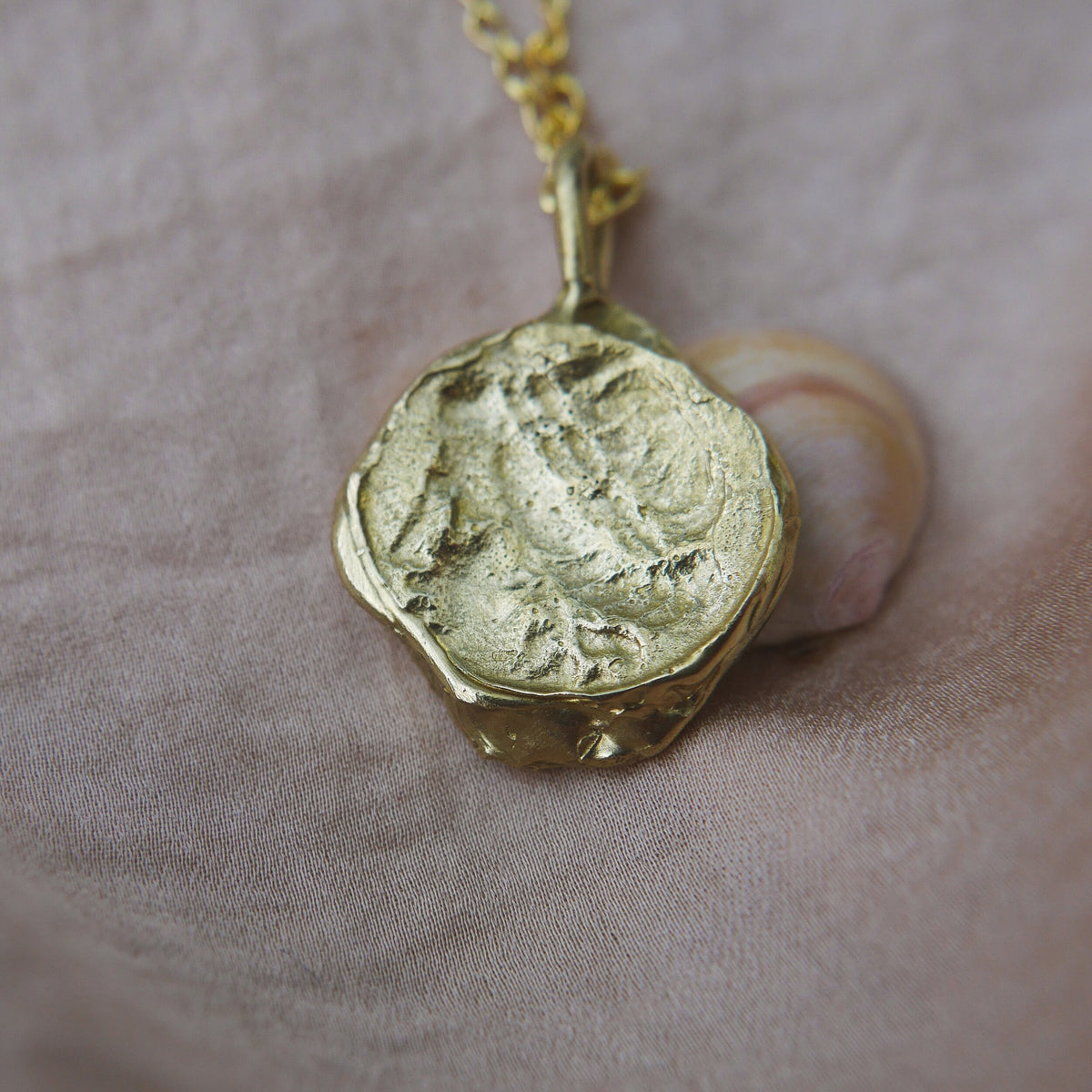 Cast in a warm bronze alloy and paired with a delicate Gold Fill curb chain, this necklace is a harmonious blend of myth, history, and artisan craftsmanship.