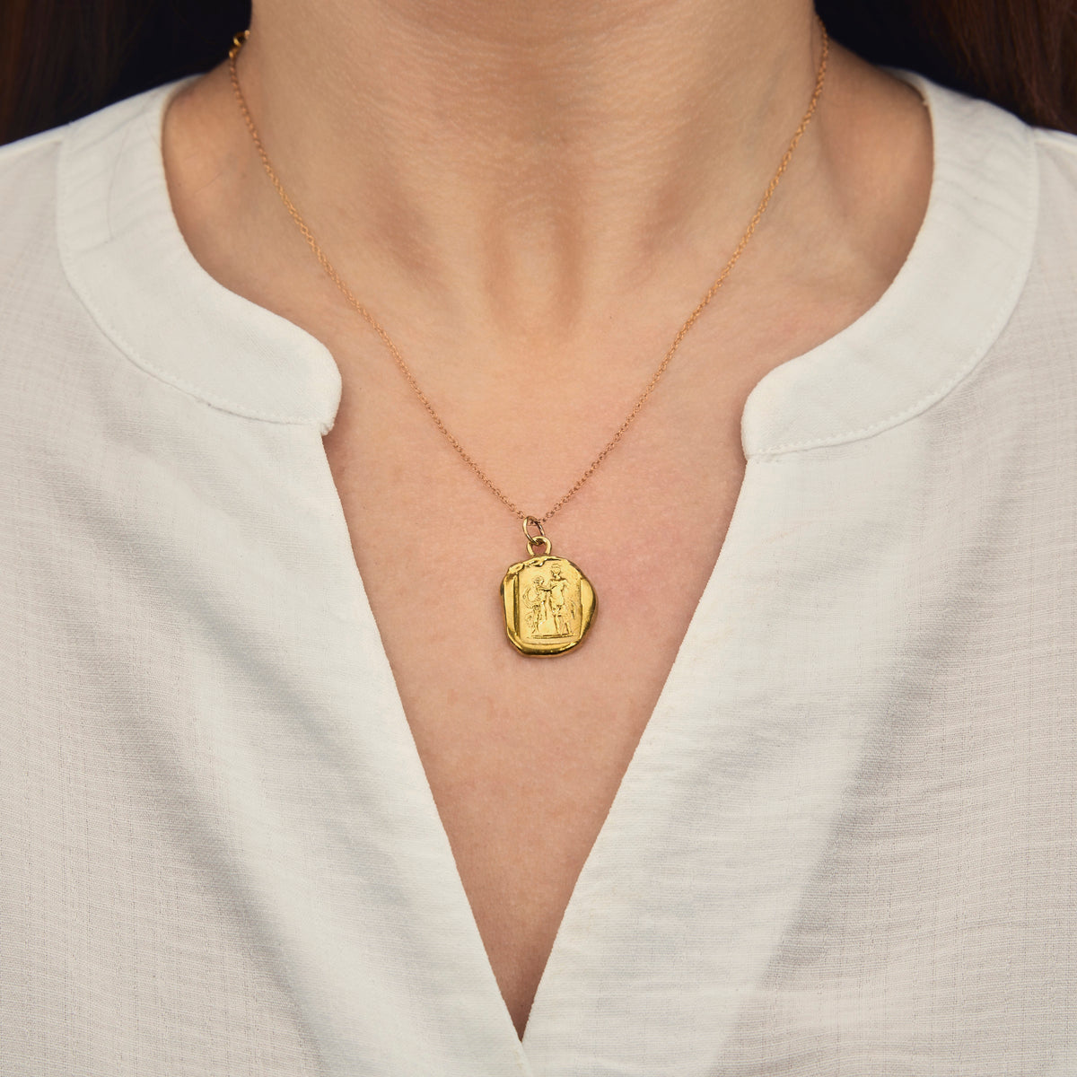 The pendant intentionally captures the melted molten droplets formed during the coin's hot pressing into wax, preserving traces of the maker's tools and hands' texture. Utilising the lost wax casting technique, the pendant is cast in bronze alloy and supplied with a curb chain in Gold Fill.