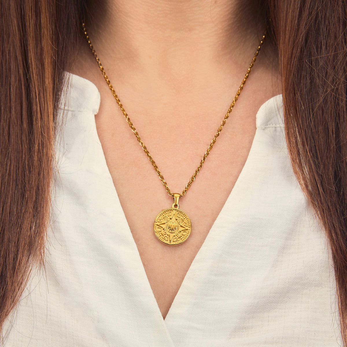 Celebrate timeless elegance with this Maya Calendar Pendant. Inspired by ancient artistry, this round medallion features intricate, symmetrical detailing with a central embossed motif that evokes historical emblems and cultural richness.